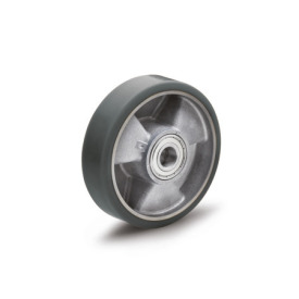 La banda de rodadura de la rueda está hecha de materiales duraderos como caucho, poliuretano o poliamida, y está diseñada para soportar altos esfuerzos mecánicos y suelos ásperos.